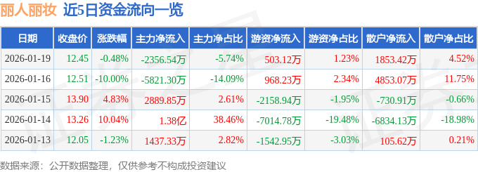 证券之星消息,截至2026年1月19日收盘,丽人丽妆(605136)报收于12.45元,下跌0.48%,换手率8.38%,成交量33.56万手,成交额4.1亿元。