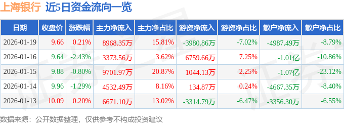 证券之星消息,截至2026年1月19日收盘,上海银行(601229)报收于9.66元,上涨0.21%,换手率0.41%,成交量58.83万手,成交额5.67亿元。