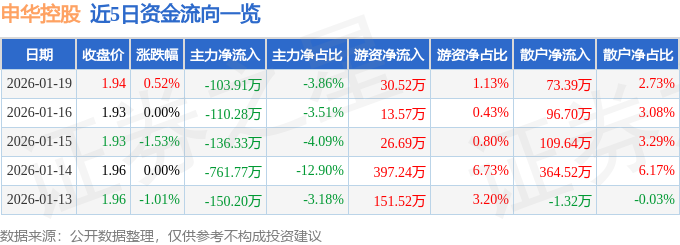 证券之星消息,截至2026年1月19日收盘,申华控股(600653)报收于1.94元,上涨0.52%,换手率0.71%,成交量13.87万手,成交额2691.45万元。