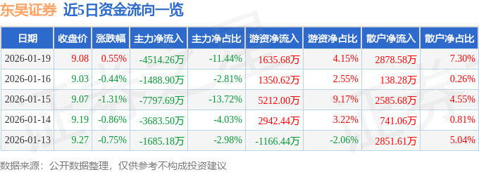 证券之星消息,截至2026年1月19日收盘,东吴证券(601555)报收于9.08元,上涨0.55%,换手率0.88%,成交量43.68万手,成交额3.95亿元。