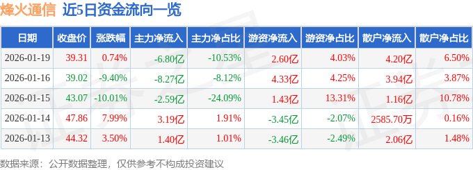 证券之星消息,截至2026年1月19日收盘,烽火通信(600498)报收于39.31元,上涨0.74%,换手率12.83%,成交量163.13万手,成交额64.61亿元。