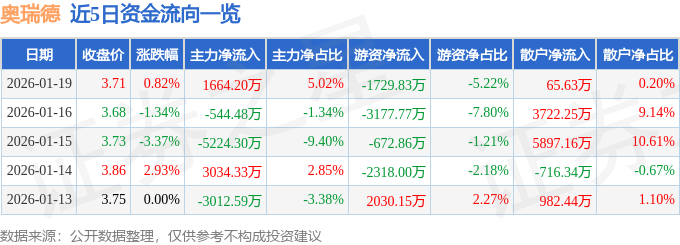 证券之星消息,截至2026年1月19日收盘,奥瑞德(600666)报收于3.71元,上涨0.82%,换手率3.73%,成交量90.22万手,成交额3.32亿元。