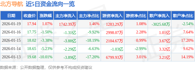 证券之星消息,截至2026年1月19日收盘,北方导航(600435)报收于17.94元,上涨1.07%,换手率4.41%,成交量66.75万手,成交额11.91亿元。