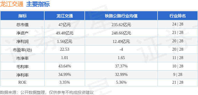 龙江交通2025年三季报显示,前三季度公司主营收入4.69亿元,同比上升13.0%;归母净利润1.56亿元,同比上升3.21%;扣非净利润1.59亿元,同比上升1.27%;其中2025年第三季度,公司单季度主营收入2.25亿元,同比上升18.02%;单季度归母净利润6170.79万元,同比下降14.36%;单季度扣非净利润6035.87万元,同比下降13.68%;负债率9.7%,投资收益6460.02万元,财务费用-460.38万元,毛利率43.64%。龙江交通(601188)主营业务:高速公路收费管理。
