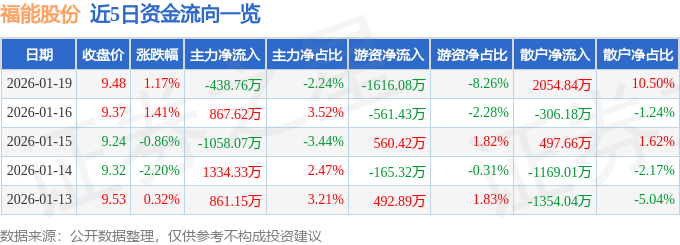 证券之星消息,截至2026年1月19日收盘,福能股份(600483)报收于9.48元,上涨1.17%,换手率0.74%,成交量20.71万手,成交额1.96亿元。