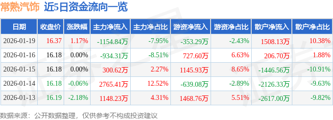 证券之星消息,截至2026年1月19日收盘,常熟汽饰(603035)报收于16.37元,上涨1.17%,换手率2.43%,成交量8.91万手,成交额1.45亿元。