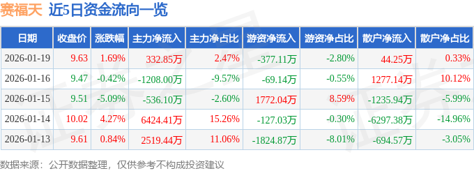 证券之星消息,截至2026年1月19日收盘,赛福天(603028)报收于9.63元,上涨1.69%,换手率4.97%,成交量14.13万手,成交额1.35亿元。