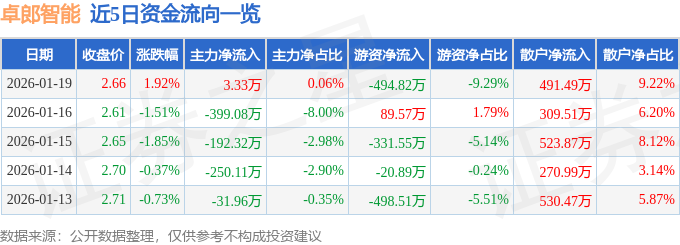 证券之星消息,截至2026年1月19日收盘,卓郎智能(600545)报收于2.66元,上涨1.92%,换手率1.13%,成交量20.19万手,成交额5328.71万元。