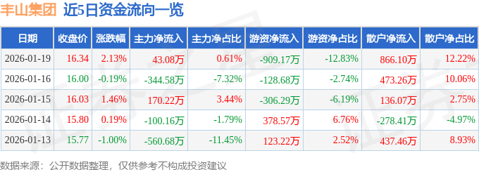 证券之星消息,截至2026年1月19日收盘,丰山集团(603810)报收于16.34元,上涨2.13%,换手率2.68%,成交量4.43万手,成交额7085.9万元。
