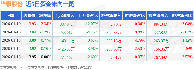 证券之星消息,截至2026年1月19日收盘,华泰股份(600308)报收于3.93元,上涨2.34%,换手率1.24%,成交量18.86万手,成交额7346.42万元。