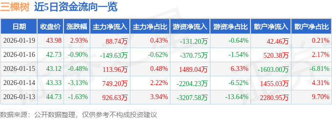 证券之星消息,截至2026年1月19日收盘,三棵树(603737)报收于43.98元,上涨2.93%,换手率0.64%,成交量4.71万手,成交额2.05亿元。