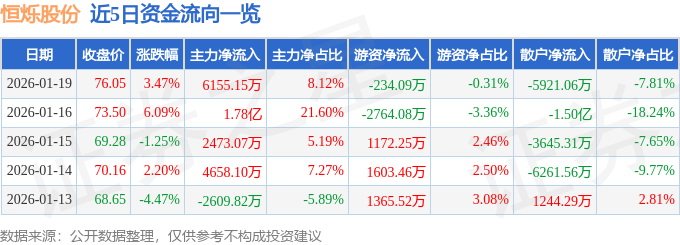证券之星消息,截至2026年1月19日收盘,恒烁股份(688416)报收于76.05元,上涨3.47%,换手率15.61%,成交量10.2万手,成交额7.58亿元。