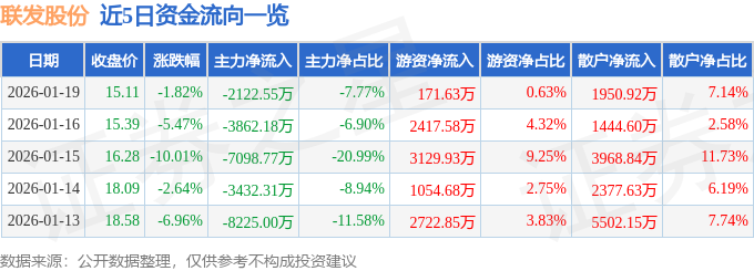 证券之星消息,截至2026年1月19日收盘,联发股份(002394)报收于15.11元,下跌1.82%,换手率5.56%,成交量17.96万手,成交额2.73亿元。