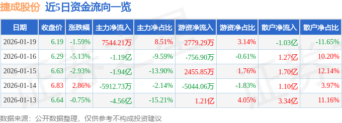 证券之星消息,截至2026年1月19日收盘,捷成股份(300182)报收于6.19元,下跌1.59%,换手率6.32%,成交量142.77万手,成交额8.86亿元。