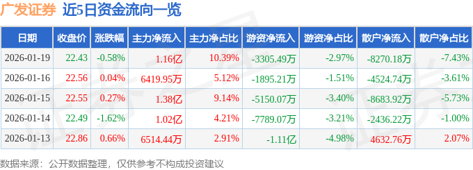 证券之星消息,截至2026年1月19日收盘,广发证券(000776)报收于22.43元,下跌0.58%,换手率0.84%,成交量49.86万手,成交额11.14亿元。