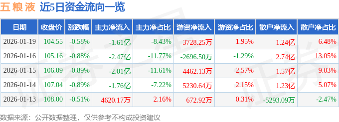 证券之星消息,截至2026年1月19日收盘,五 粮 液(000858)报收于104.55元,下跌0.58%,换手率0.47%,成交量18.23万手,成交额19.08亿元。