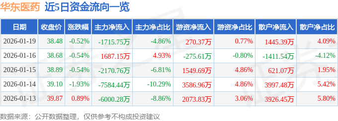 证券之星消息,截至2026年1月19日收盘,华东医药(000963)报收于38.48元,下跌0.52%,换手率0.52%,成交量9.17万手,成交额3.53亿元。