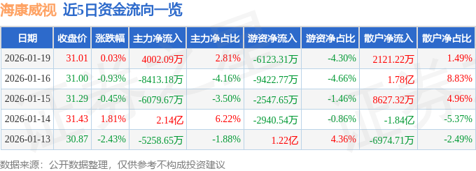 证券之星消息,截至2026年1月19日收盘,海康威视(002415)报收于31.01元,上涨0.03%,换手率0.51%,成交量45.92万手,成交额14.25亿元。