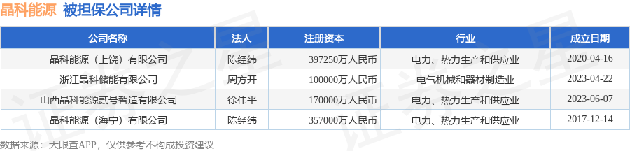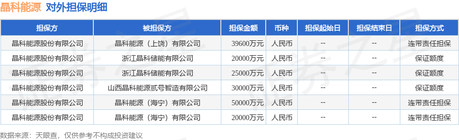 晶科能源1月16日披露6笔对外担保,被担保公司4家。对外担保明细如下表: