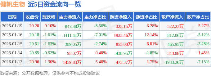 证券之星消息,截至2026年1月19日收盘,健帆生物(300529)报收于20.2元,上涨0.1%,换手率0.96%,成交量4.9万手,成交额9901.06万元。