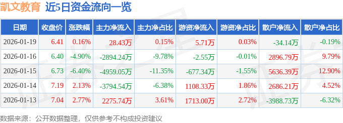 证券之星消息,截至2026年1月19日收盘,凯文教育(002659)报收于6.41元,上涨0.16%,换手率4.82%,成交量28.81万手,成交额1.85亿元。