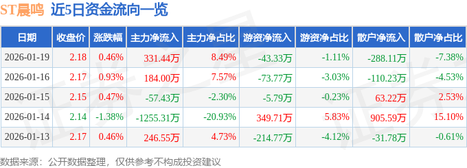 证券之星消息,截至2026年1月19日收盘,ST晨鸣(000488)报收于2.18元,上涨0.46%,换手率1.07%,成交量17.97万手,成交额3905.53万元。