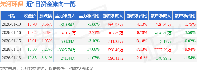 证券之星消息,截至2026年1月19日收盘,先河环保(300137)报收于10.7元,上涨0.56%,换手率2.44%,成交量12.96万手,成交额1.38亿元。