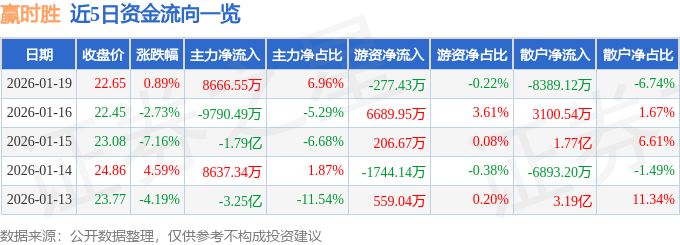 证券之星消息,截至2026年1月19日收盘,赢时胜(300377)报收于22.65元,上涨0.89%,换手率8.06%,成交量55.7万手,成交额12.45亿元。