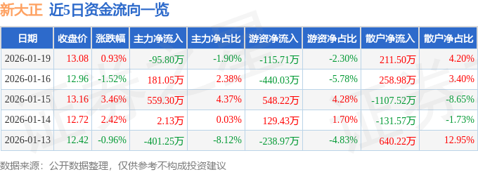 证券之星消息,截至2026年1月19日收盘,新大正(002968)报收于13.08元,上涨0.93%,换手率1.81%,成交量3.86万手,成交额5031.97万元。