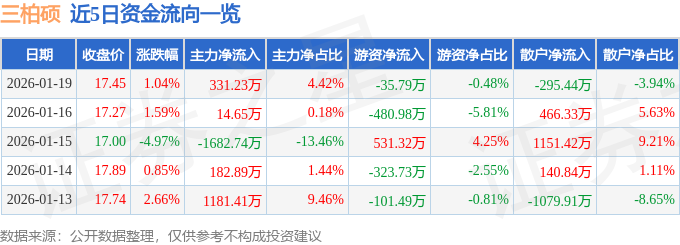 证券之星消息,截至2026年1月19日收盘,三柏硕(001300)报收于17.45元,上涨1.04%,换手率1.78%,成交量4.33万手,成交额7492.04万元。