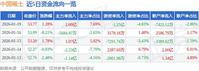 证券之星消息,截至2026年1月19日收盘,中国稀土(000831)报收于53.77元,上涨1.28%,换手率4.53%,成交量48.05万手,成交额25.95亿元。
