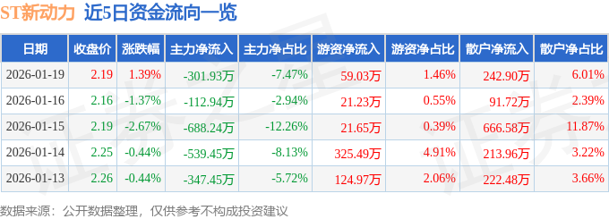 证券之星消息,截至2026年1月19日收盘,ST新动力(300152)报收于2.19元,上涨1.39%,换手率2.61%,成交量18.57万手,成交额4043.91万元。