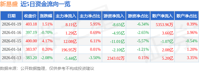 证券之星消息,截至2026年1月19日收盘,新易盛(300502)报收于403.18元,上涨1.51%,换手率3.82%,成交量33.84万手,成交额136.36亿元。