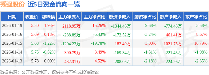 证券之星消息,截至2026年1月19日收盘,秀强股份(300160)报收于5.8元,上涨1.93%,换手率3.17%,成交量24.14万手,成交额1.39亿元。