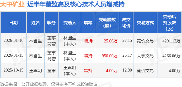 证券之星消息,根据1月19日市场公开信息、上市公司公告及交易所披露数据整理,大中矿业(001203)最新董监高及相关人员股份变动情况:2026年1月16日公司董事,高管林圃生共增持公司股份25.06万股,占公司总股本为0.0163%。变动期间公司股价下跌5.16%,1月16日当日收盘报27.2元。