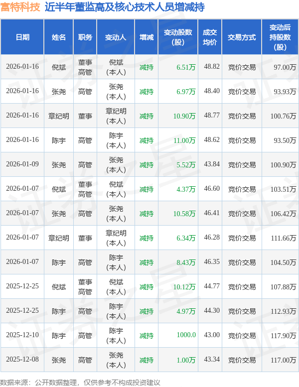 富特科技近半年内的董监高及核心技术人员增减持详情如下: