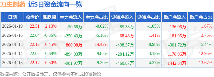 证券之星消息,截至2026年1月19日收盘,力生制药(002393)报收于22.51元,上涨2.13%,换手率1.45%,成交量3.64万手,成交额8156.25万元。
