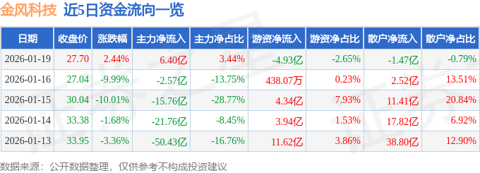 证券之星消息,截至2026年1月19日收盘,金风科技(002202)报收于27.7元,上涨2.44%,换手率21.15%,成交量711.65万手,成交额185.98亿元。