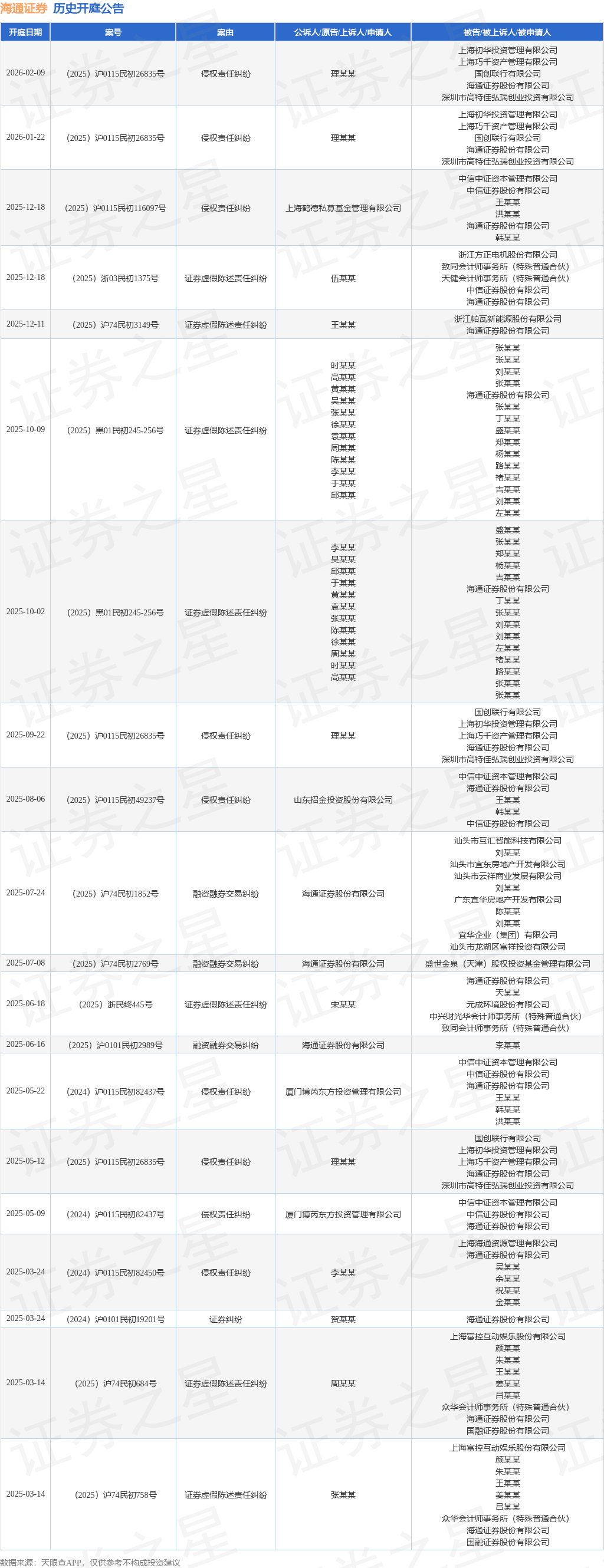 案号:(2025)沪0115民初26835号根据统计,近一年内以海通证券股份有限公司为当事人的历史开庭公告有24则,其中案由为“侵权责任纠纷”的公告以10则居首,其次为“证券虚假陈述责任纠纷”有9则,“融资融券交易纠纷”有4则。历史开庭公告(前20条)如下: