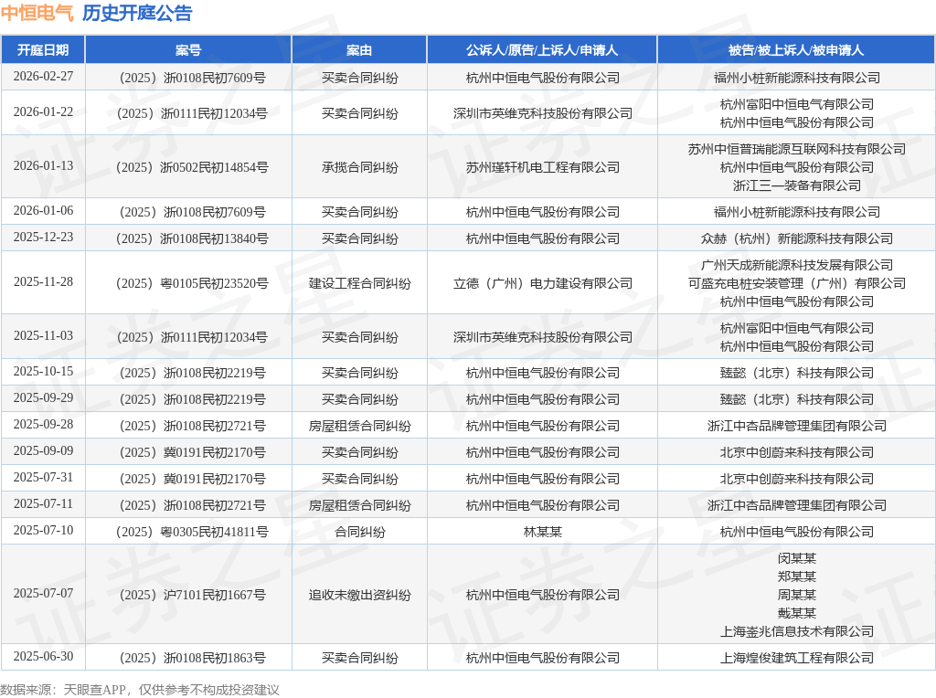 案号:(2025)浙0111民初12034号根据统计,近一年内以杭州中恒电气股份有限公司为当事人的历史开庭公告有16则,其中案由为“买卖合同纠纷”的公告以10则居首,其次为“房屋租赁合同纠纷”有2则,“合同纠纷”有1则。历史开庭公告如下: