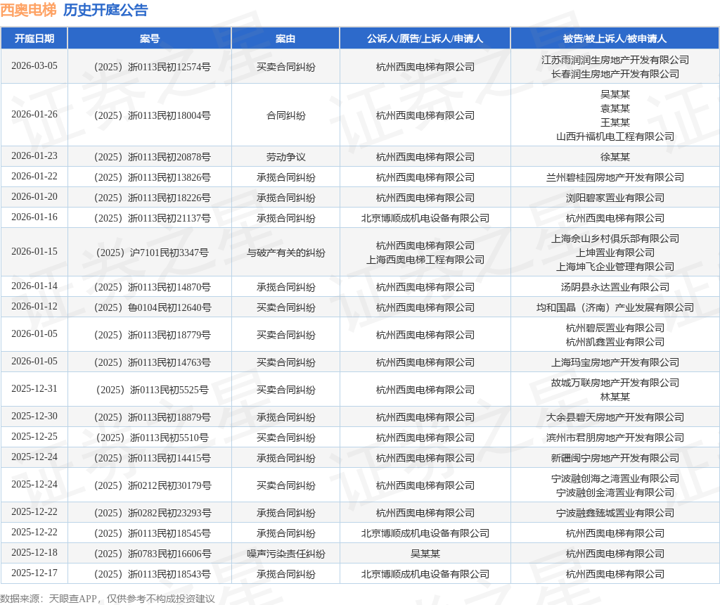 案号:(2025)浙0113民初13826号根据统计,近一年内以杭州西奥电梯有限公司为当事人的历史开庭公告有172则,其中案由为“买卖合同纠纷”的公告以69则居首,其次为“承揽合同纠纷”有62则,“合同纠纷”有10则。历史开庭公告(前20条)如下:
