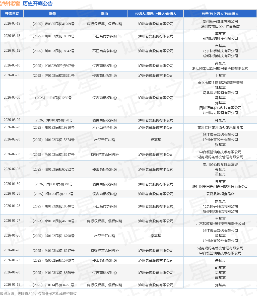 案号:(2025)浙0502民初15709号根据统计,近一年内以泸州老窖股份有限公司为当事人的历史开庭公告有330则,其中案由为“侵害商标权纠纷”的公告以242则居首,其次为“侵害商标权”有39则,“商标权权属、侵权纠纷”有10则。历史开庭公告(前20条)如下: