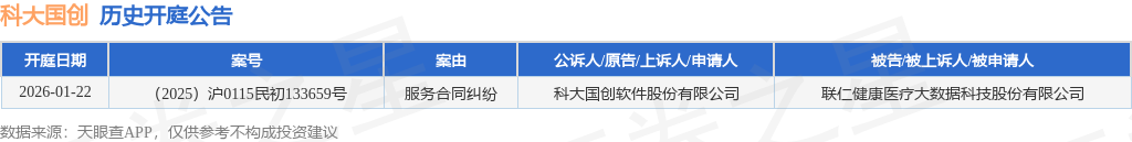 证券之星消息,根据天眼查APP显示,近日公布了一则科大国创软件股份有限公司作为原告/上诉人的开庭公告,详细内容如下: