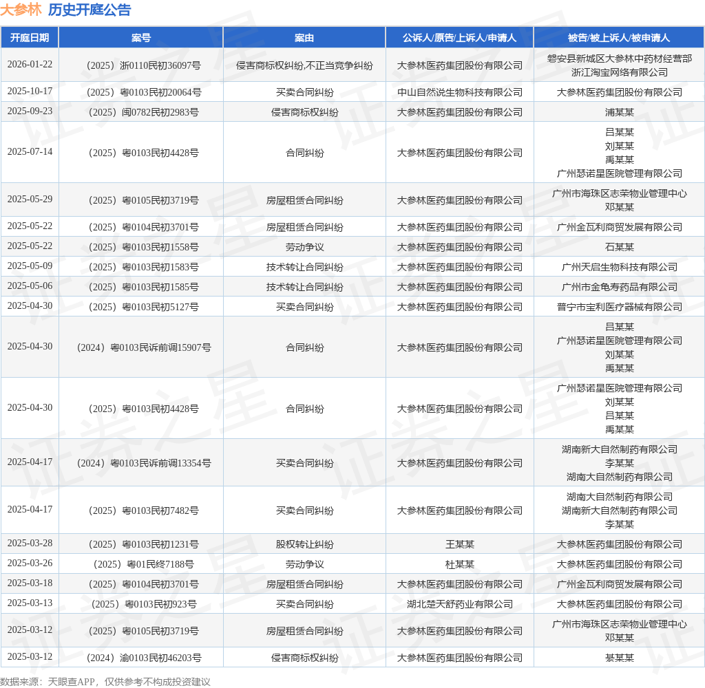 案号:(2025)浙0110民初36097号根据统计,近一年内以大参林医药集团股份有限公司为当事人的历史开庭公告有24则,其中案由为“买卖合同纠纷”的公告以7则居首,其次为“房屋租赁合同纠纷”有4则,“劳动争议”有3则。历史开庭公告(前20条)如下:
