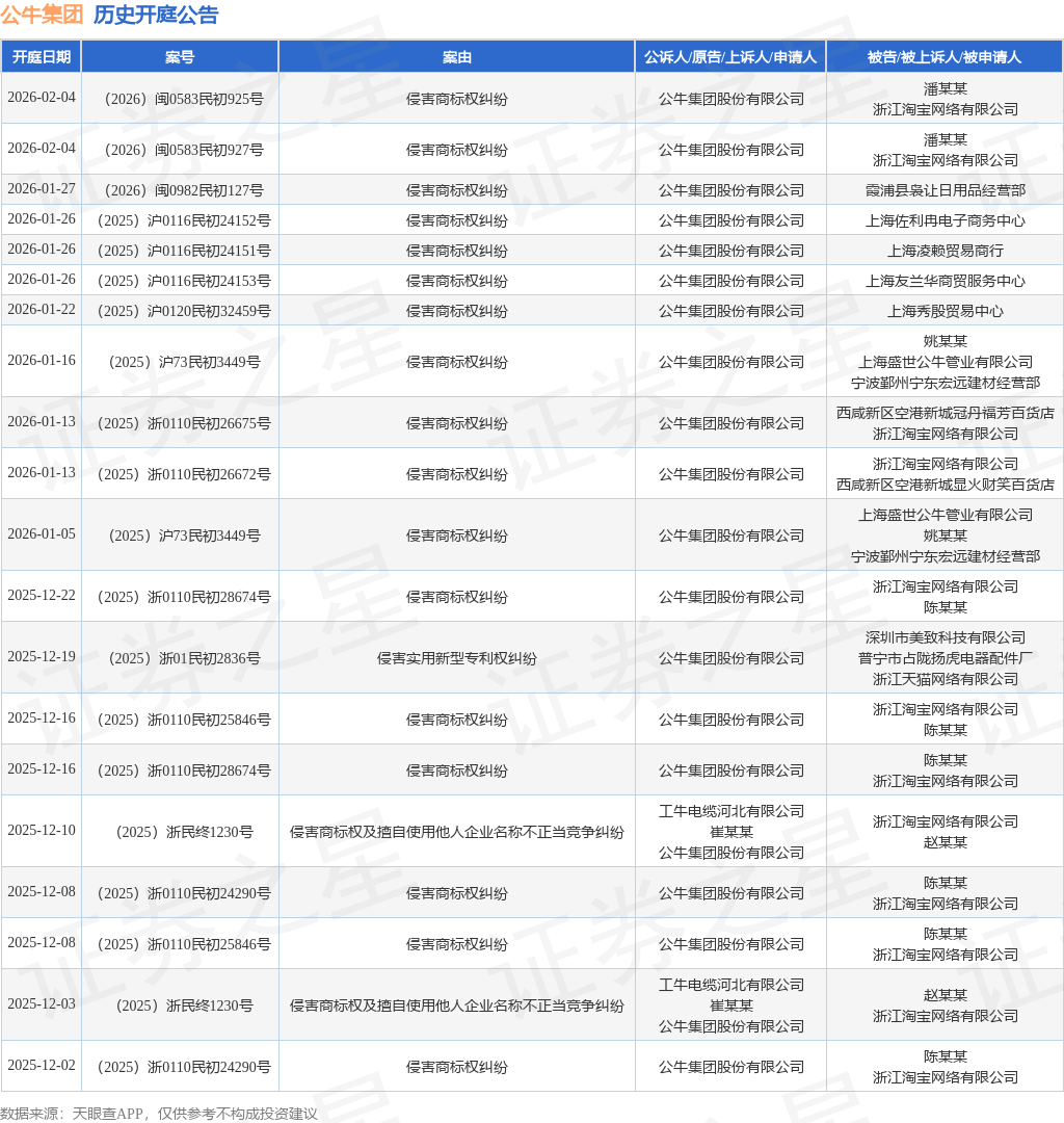 案号:(2025)沪0120民初32459号根据统计,近一年内以公牛集团股份有限公司为当事人的历史开庭公告有143则,其中案由为“侵害商标权纠纷”的公告以111则居首,其次为“不正当竞争纠纷”有14则,“服务合同纠纷”有3则。历史开庭公告(前20条)如下: