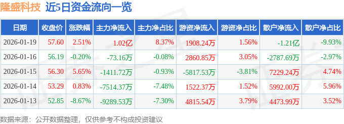 证券之星消息,截至2026年1月19日收盘,隆盛科技(300680)报收于57.6元,上涨2.51%,换手率12.14%,成交量21.34万手,成交额12.23亿元。