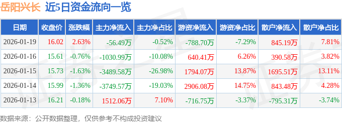 证券之星消息,截至2026年1月19日收盘,岳阳兴长(000819)报收于16.02元,上涨2.63%,换手率1.86%,成交量6.79万手,成交额1.08亿元。