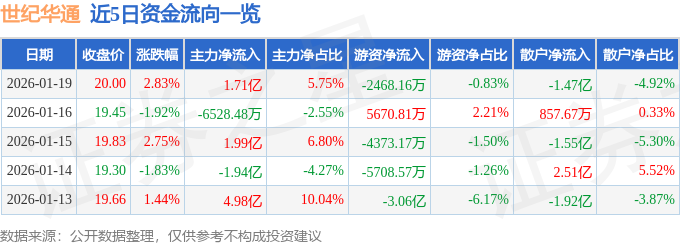 证券之星消息,截至2026年1月19日收盘,世纪华通(002602)报收于20.0元,上涨2.83%,换手率2.21%,成交量149.98万手,成交额29.82亿元。