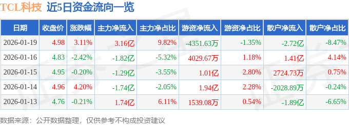 证券之星消息,截至2026年1月19日收盘,TCL科技(000100)报收于4.98元,上涨3.11%,换手率3.59%,成交量649.57万手,成交额32.15亿元。