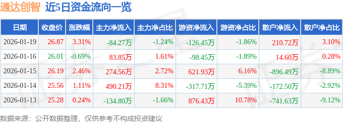 证券之星消息,截至2026年1月19日收盘,通达创智(001368)报收于26.87元,上涨3.31%,换手率7.94%,成交量2.55万手,成交额6789.69万元。